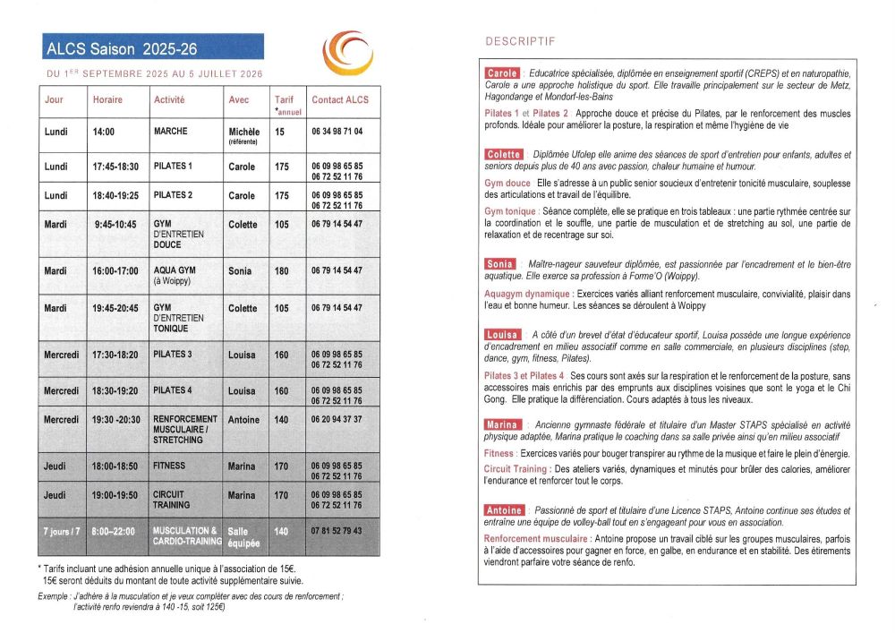 Gym Douce : mardi : 09h45 - Gym Tonique : mardi 19h45